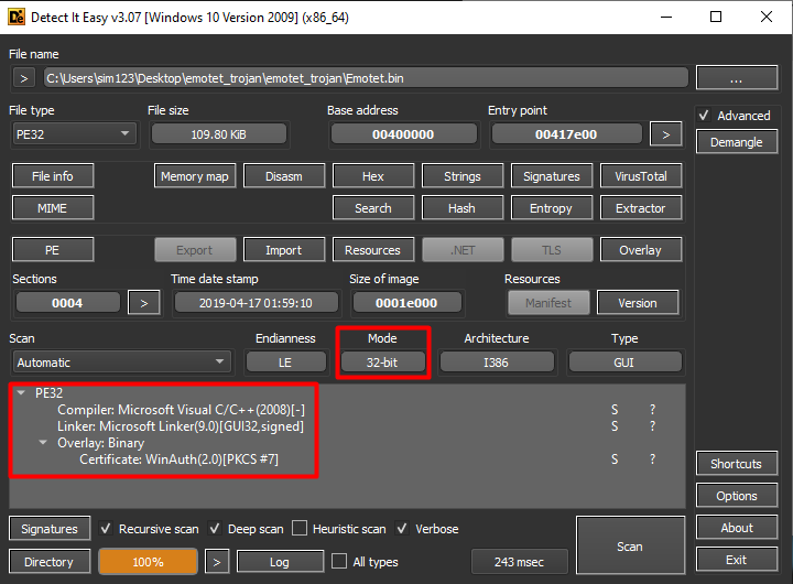 We can see that it is a 32-bit binary, made in C/C++ and having a certificate stored in the overlay section (WinAuth(2.0))